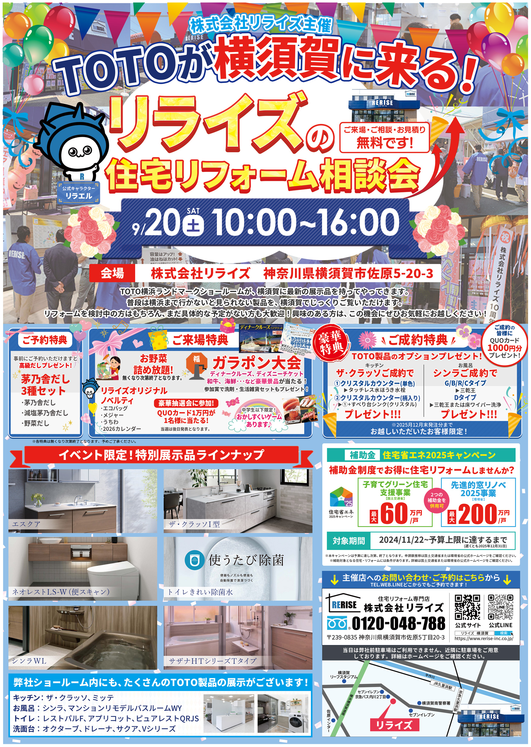 ■ご予約特典 ▶茅乃舎だし3種セット(茅乃舎だし、減塩茅乃舎だし、野菜だし)プレゼント ■ご来場特典 ▶リライズのオリジナルノベルティ5種プレゼント ▶ガラポン大会で豪華景品が当たるかも! ディナークルーズ、ディズニーチケット、和牛、海鮮など豪華景品が当たる! ▶お野菜詰め放題! 袋に入るだけ詰め放題♪大好評の特典です! ▶豪華抽選会に参加! QUOカード1万円が1名様に当たる! LINE友達追加&インスタフォローで当選率UP!※後日結果発表となります。 ▶お子様限定のおかしすくいゲームもあります♪ ※中学生以下 ※ご来場特典は無くなり次第終了となります、予めご了承ください。 ■ご成約特典 ▶QUOカード1000円分プレゼント! TOTO製品のご成約で豪華オプションプレゼント!!! ▶ザ・クラッソご成約で ①クリスタルカウンター(単色) ・タッチレス水ほうき水栓プレゼント! ②クリスタルカウンター(柄入り) ・①+すべり台シンク(クリスタル)プレゼント! ▶シンラご成約で G/B/R/Cタイプ ・三乾王プレゼント! Dタイプ ・三乾王または、床ワイパー洗浄プレゼント! ※ご成約特典は2025年12末発注分までとなります。 ※イベントへお越しいただいたお客様限定の特典となります。 |