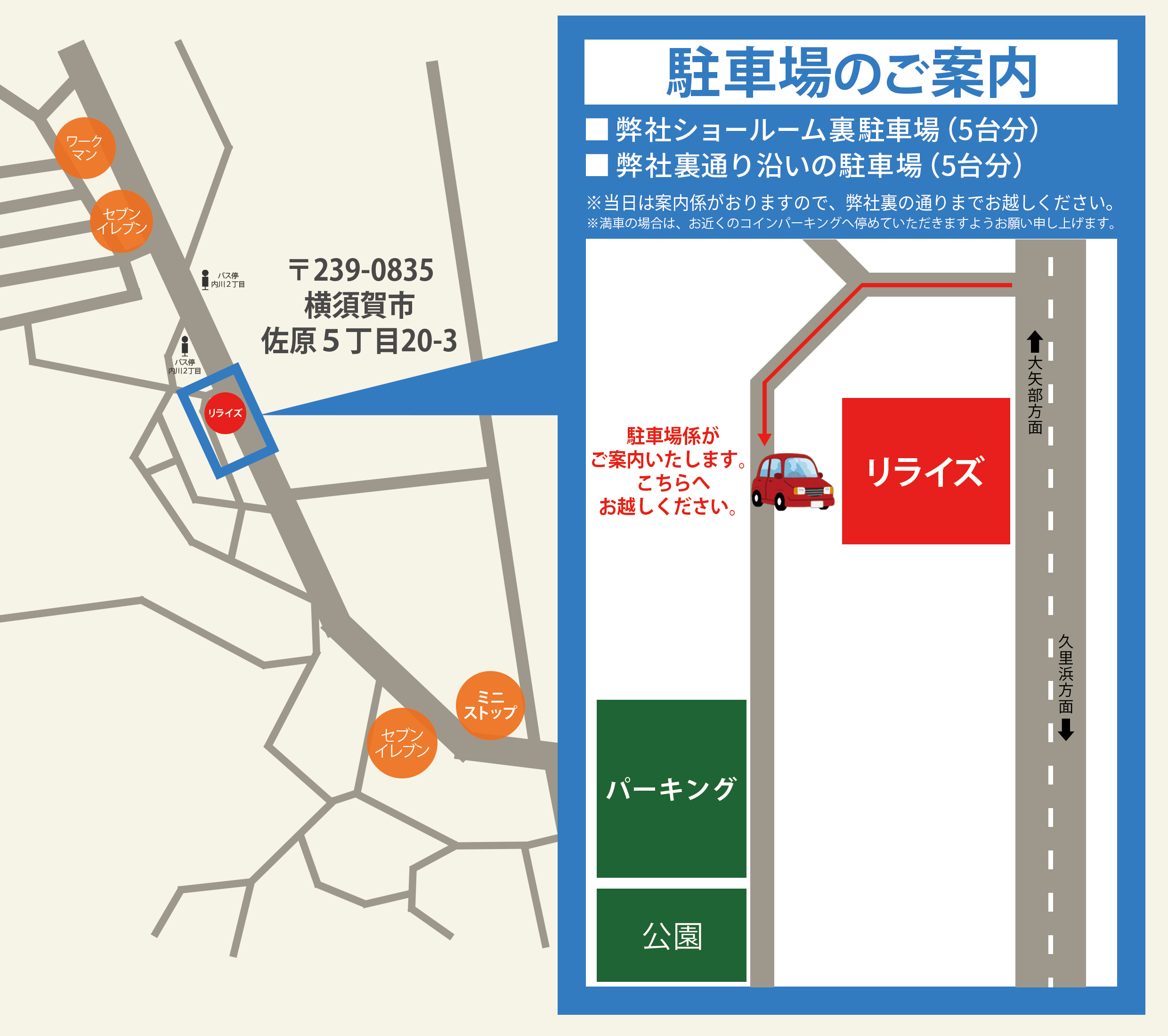 ★ 当日の駐車場について ★ イベント当日は正面駐車場が使用できません。 弊社の裏の通りへお越しください、駐車場係がご案内いたします。 ★ 所要時間の目安 ★ ご相談内容によって前後いたしますが、 概ね60分~90分程度を予定しております。 ご希望の終了時間がある方は、申込フォームの内容欄にご記入ください。 |