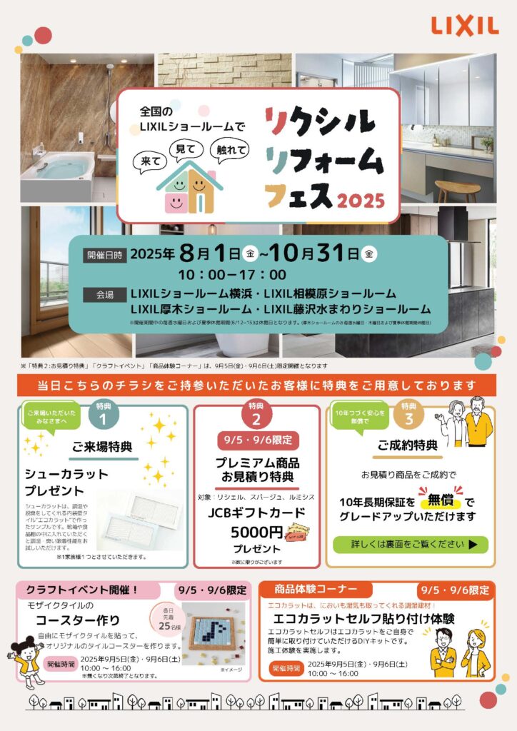 終了 LIXIL リフォームフェス 2025 会場 LIXILショールーム横浜 神奈川県横浜市西区みなとみらい4-4-5横浜アイマークプレイス3F 日付 2025年8月1日(金)~10月31日(金) 時間 10:00~17:00