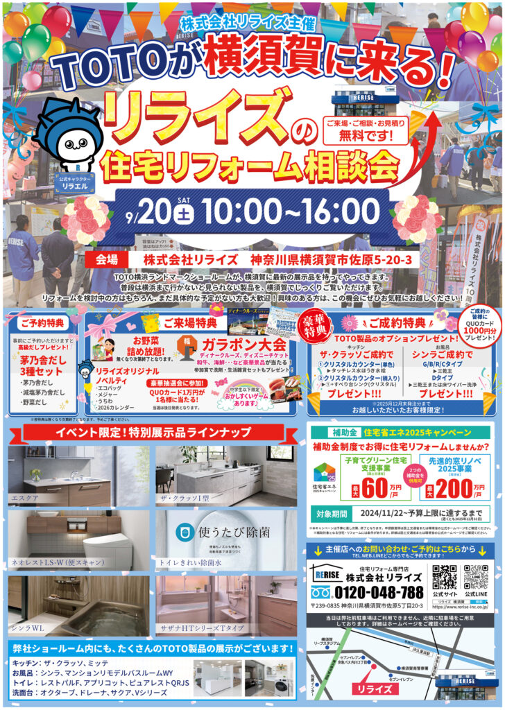 終了 リライズイベントのお知らせ TOTOが横須賀に来る! 住宅リフォーム相談会! 会場 株式会社リライズ 神奈川県横須賀市 佐原5-20-3 日付 2025年 9月20日(土) 時間 10:00~16:00 アクセス ◆ お車でお越しの方 横浜横須賀道路「佐原インター」より約5分 ◆ 電車でお越しの方 京浜急行線・JR線 京急久里浜駅・久里浜駅 下車徒歩約15分 ◆ 電車・バスでお越しの方 ①京浜急行線「京急久里浜駅」またはJR線「久里浜駅」より 「京浜急行バス」 北久里浜駅行き乗車 ② 京浜急行線「北久里浜駅」より 「京浜急行バス」 JR久里浜駅行き乗車 →(①②ともに) バス停「内川二丁目」下車 徒歩約2分
